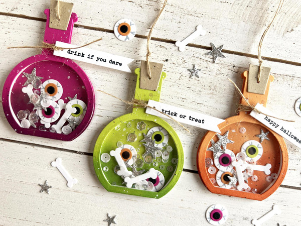Floating eyeballs and spooky little bones? Yes indeed! The Potion Bottle Die & Clear Combo allows you to add both and provides what you need to design a fun shaker card! Label your potion bottles using the included banner and your choice of four sentiments. You'll have fun creating a plethora of recipes in traditional Halloween colors and bright ones too. Don't forget to add on the little star die cuts to make your project shine! Sentiments include: Happy Halloween, Drink if you dare, Trick or treat, Boo to you. Includes 9 dies (largest ghost measures 1.25" x.75") and 2"x2" sized clear stamp set.
