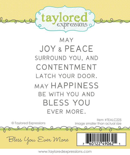 When you need your greeting to say the perfect blessing, but you can't conjure up the words yourself, the Bless You Ever More sentiment has you covered! This red rubber sentiment stamps crisp and clear for the focal image on the front of a card or fits swimmingly inside a card too! Consider using a TE stacklet to pop up your sentiment over a stenciled or stamped background. With this stamp you'll have a heartfelt greeting in a snap! Sentiment reads: May joy & peace surround you, and contentment latch your door. May happiness be with you and bless you ever more. Single image pre-trimmed red rubber stamp mounted on cling foam. Measures 2.5" x 3.5"