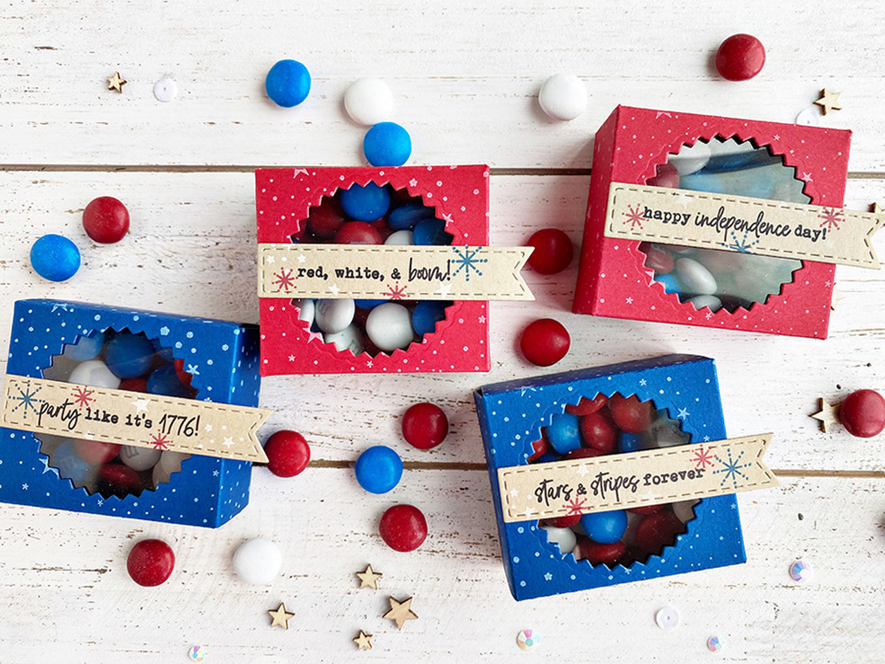 Make adorable treat boxes and gift tags for the 4th of July and other celebratory occasions with our All Tucked In - Patriotic stamp set. Perfectly sized to coordinate with the All Tucked In Windows and the All Tucked In dies (sold separately), this set includes stamps of stars and fireworks as well as a variety of sentiments that fit on the narrow strip between the All Tucked In Windows. Set of 21 clear photopolymer stamps. Comes packaged on a 3" x 4" clear folder for easy storage.