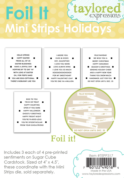 The Foil It - Mini Strips Holidays have your holiday projects covered... and then some! These little sentiments pack a big punch for not only a variety of seasonal holidays, they can be used year round! Simply foil the Mini Strip panels and die cut them out in a jiffy using any of our Mini Strips coordinating dies (sold separately). These are awesome for adding to larger sentiments or popping up with foam tape to add some extra dimension! Sentiments included on these Foil It panels come from these sets: Mini Strips - Easter, Mini Strips - Valentine, Mini Strips - Halloween, Mini Strips - Holiday. Includes 3 each of 4 pre-printed sentiments on Sugar Cube Cardstock. Sized at 4" x 4.5" these coordinate with the Mini Strips die, sold separately. Please note: Our Foil It products are designed to work with a Minc or laminator. They are not compatible with the Spellbinders Glimmer Machine (or other similar hot foiling products).