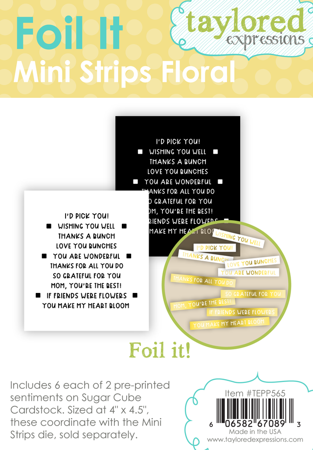 Dazzle your card recipients with Foil It - Mini Strips Floral! These panels come in both regular and reverse versions. This pack includes toner-printed panels filled with sentiments that pair well with floral designs. Simply choose your favorite TE Fun Foil, place it over the panel, and run it through your heat source. The foil adheres to the toner-printed areas, making the sentiments pop for an extra dose of sparkle in your creations! Sentiments include (each in regular and reverse): I'd pick you, Wishing you well, Thanks a bunch, You are wonderful, Thanks for all you do, So grateful for you, Mom, you're the best! If friends were flowers, You make my heart bloom. Includes 12 pre-printed panels (x each of x designs) measuring 4 x 5 1/4 in. Printed on Sugar Cube cardstock. Please note: Our Foil It products are designed to work with a Minc or laminator. They are not compatible with the Spellbinders Glimmer Machine (or other similar hot foiling tools). Coordinates with Mini Strips Dies (sold separately).