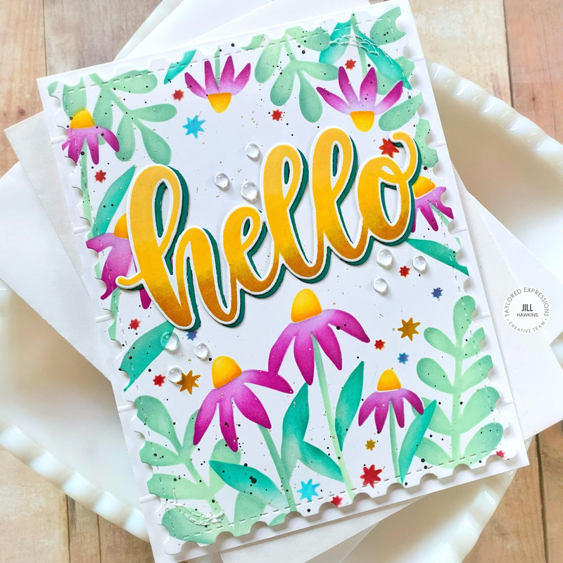 Capture the essence of a warm, magical evening with the Summer Nights Layering Stencil. This set of 4 stencils layer together to create a stunning border of coneflowers and greenery, perfect for framing your summery projects! Use the alignment squares included on each stencil layer to ensure your design lines up perfectly. Includes 4 stencils measuring 6 x 6 in. each. The image created is designed to fit vertical A2 cards. Coordinates with Embossing Folder - Summer Nights and Summer Nights Inside Frame Die.
