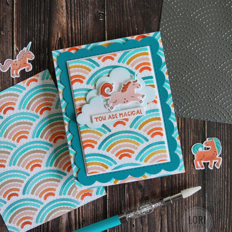 This set of 6 stencils layer together to create a colorful rainbow with the Fanfare Cutting Plate (sold separately). Use the alignment squares included on each stencil layer to ensure your design lines up perfectly, making it easy to achieve a stunning, multicolored pattern. Simply choose your favorite TE Premium Ink and let your creativity flow! Includes 6 stencils measuring 6 x 6 in. Coordinates with the Fanfare Cutting Plate (sold separately).