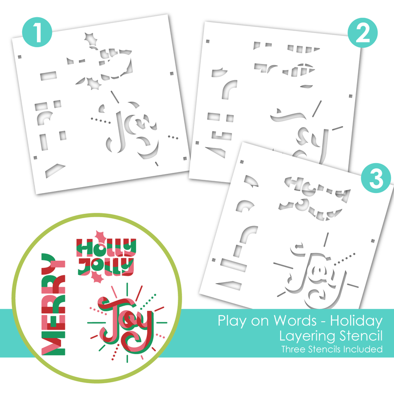 Get in the holiday spirit with Play on Words - Holiday Layering Stencil! This set of 3 stencils layer together to create bold, marbled block holiday words: Merry, Holly Jolly, and Joy. Use the convenient alignment squares on each stencil layer to ensure your design lines up perfectly. Includes 3 stencils measuring 6 x 6 in. each.