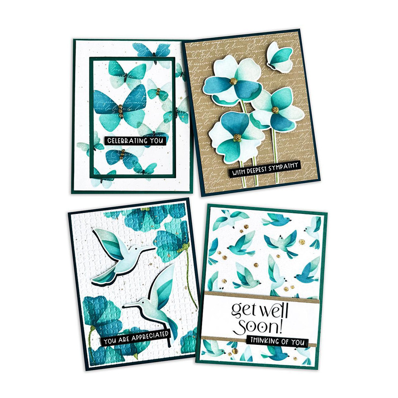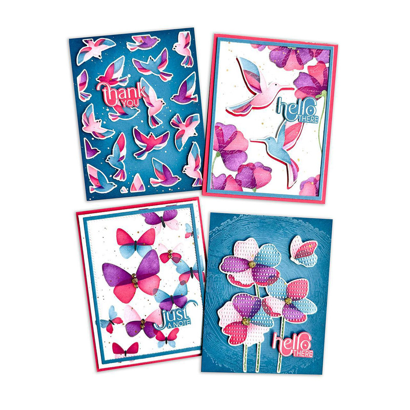 Create four stunning A2 card designs in minutes with the Create-in-Quads Layering Stencil - Flit & Flutter! Our innovative Create-in-Quads Layering Stencils make it easy to craft four beautiful, coordinated looks for your handmade projects. The four panels this set creates are: hummingbirds peeking into flowers, delicate butterflies, graceful flying birds, and a trio of flowers with a fluttering butterfly. Perfect for crafting cards that capture the beauty of nature in a flash! Simply place a piece of Create-in-Quads Paper (sold separately) or an 8 x 10 1/2 in. piece of TE Premium Cardstock under the stencil, apply your favorite medium, and use the built-in alignment squares for perfect application. After blending, simply cut the full panel into quarters (4 x 5 1/4 in. each) to reveal four A2-sized card fronts. Use with your favorite TE Premium Ink or try layering with other mediums like TE Happy Medium, Astro Paste, and more! Set of 5 individual stencils (each measures 8 1/2 x 11 in.). Coordinates with products in the Create-in-Quads Flit & Flutter Collection (sold separately). Previously offered at Crop & Create Spring 2025.