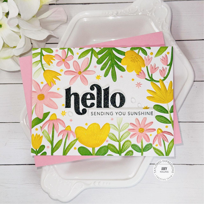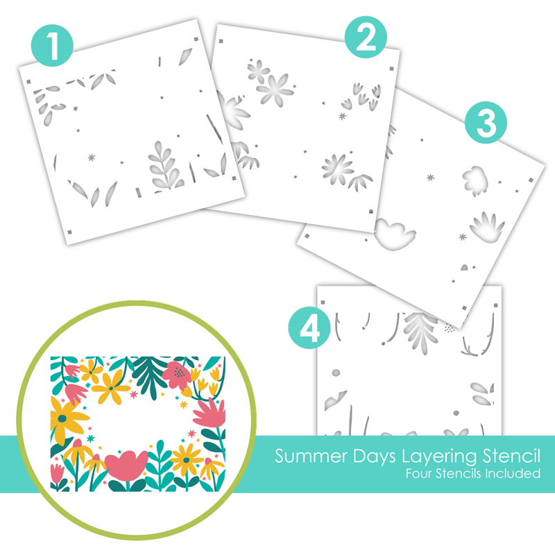 Bask in the beauty of summer with the Summer Days Layering Stencil! This fresh addition to your collection will bring a vibrant array of flowers to your projects, capturing the essence of sunny days and warm breezes. Use the convenient alignment squares on each stencil layer to ensure your design lines up perfectly. Use with your favorite TE Premium Ink or try layering with other mediums like Happy Medium, Astro Paste, and more! Includes 4 stencils measuring 6 x 6 in. each. The image created is designed to fit horizontal A2 cards. Coordinates with Summer Days Inside Frame Dies and 3D Embossing Folder - Summer Days (both sold separately).