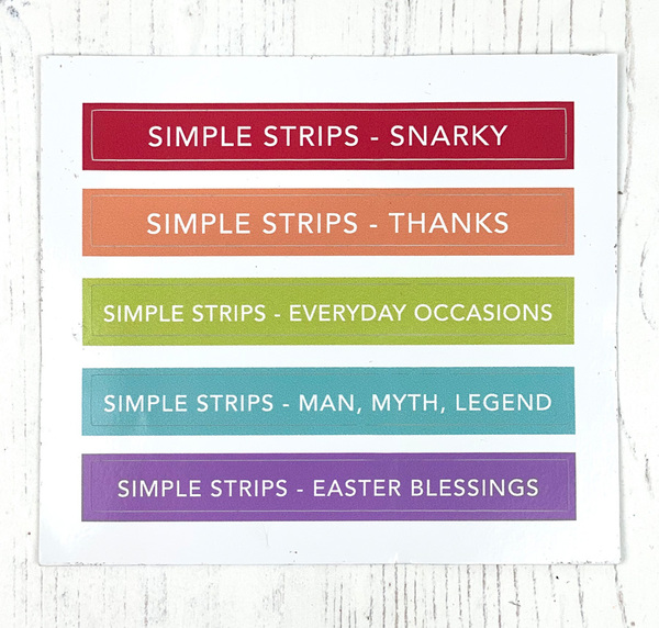 Our Simple Storage Stickers 2 picks up where our original Simple Storage Stickers left off! This set of colorful labels is pre-printed with names of a second group of Simple Strips stamps, sized perfectly to adhere to the side of the Simple Storage for Simple Strips cases so you can categorize your sentiments by stamp and find the strips you're looking for at a glance. Set of 5 vinyl stickers: Simple Strips - Snarky, Simple Strips - Thanks, Simple Strips - Everyday Occasions, Simple Strips - Man, Myth, Legend, Simple Strips - Easter Blessings.