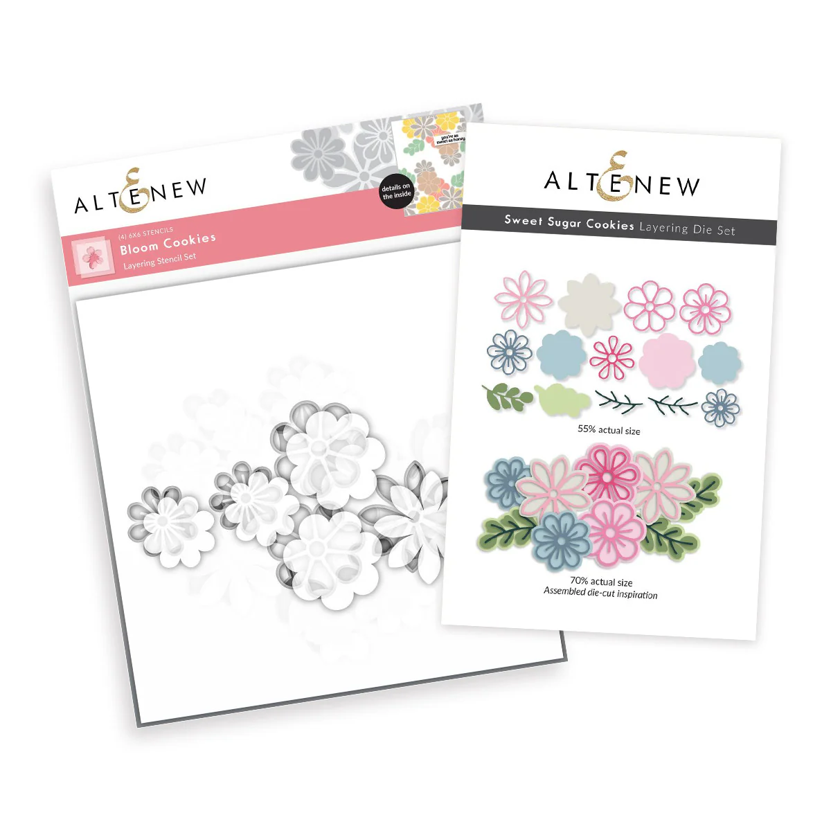 Combine the charm of sugar cookies and florals with this sweet stencil and die bundle! This is a special bundle of the Bloom Cookies Layering Stencil Set and Sweet Sugar Cookies Layering Die Set. Create delightful, sugar cookie-inspired floral designs effortlessly with the Bloom Cookies Layering Stencil Set! Inspired by sugar cookies, this stencil set features simple and effective layering. There are two sets of floral arrangements that can be layered with the help of the included masks. You can also use each arrangement on its own. There are 4 stencils in this set. Combine your love for sweets and florals with this versatile layering die set! The Sweet Sugar Cookies Layering Die Set features layers of floral sugar cookies. It includes four flowers and one leaf ensemble. The delicate layers can also be used to add texture to the Bloom Cookies Stencil Set. The larger hollow dies will layer with the delicate pieces, as well as cut the images from the Bloom Cookies Stencil Set, leaving a white border. There are 14 dies in this set. Die Dimensions: , Die 1: 1.3" x 1.3" , Die 2: 1.5" x 1.5" , Die 3: 1.7" x 1.7" *Please note that this stencil and die bundle was part of our exclusive Sweet Shoppe Party Retreat Kit.