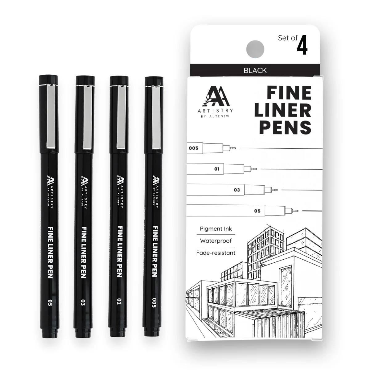Artistry by Altenew's Fine Liner Pens 2.0 deliver a smooth, controlled flow of true black pigment-based ink that is waterproof and fade-resistant. Now featuring slimmer barrels for enhanced comfort and control, these fine liners are perfect for sketching intricate designs, adding details to your cards, or perfecting your handwriting. They also pair beautifully with both Artist Alcohol Markers and Watercolors, making them a versatile tool for all your creative projects. What's Inside: 4 pens in updated nib sizes Nib Sizes: 0.05mm, 0.1mm, 0.3mm, 0.5mm Elevate your art projects with these versatile, must-have Fine Liner Pens!