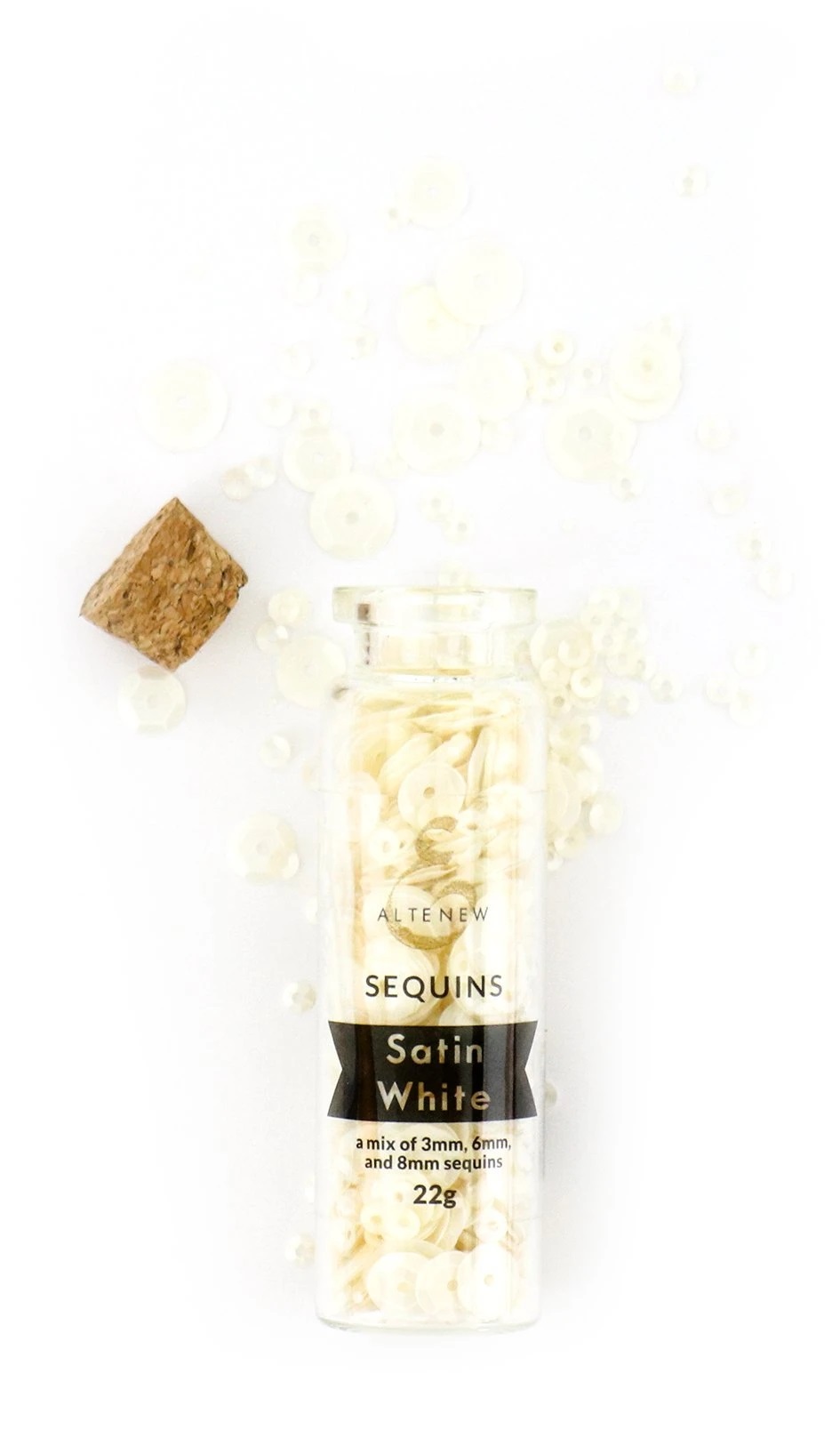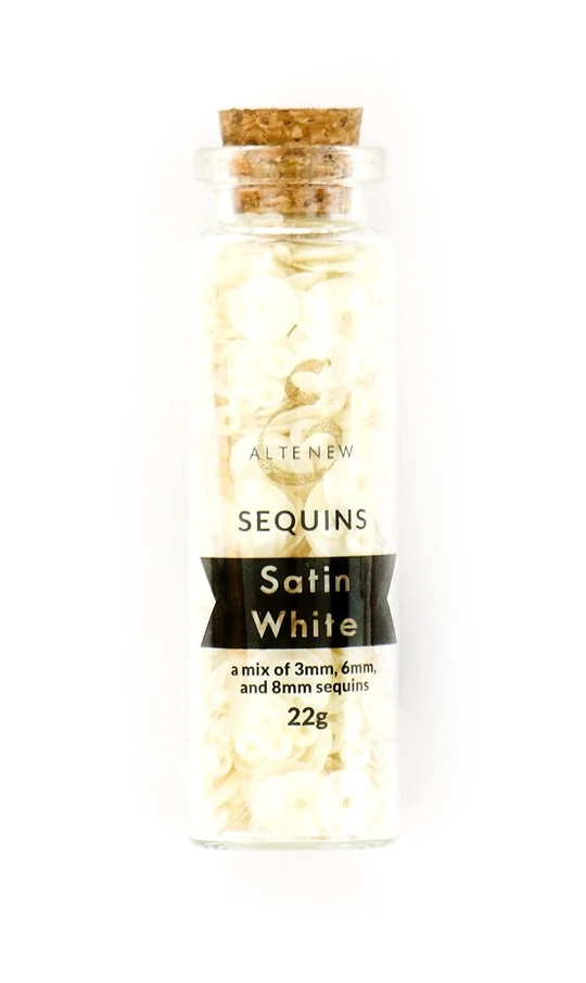 Add a touch of shimmer and sparkle to your projects with shiny sequins! This is a mix of 3mm, 6mm, and 8mm Satin White Sequins, packaged in an adorable glass container with a cork stopper. Organizing just got a lot more beautiful! This product contains 22g of sequins.