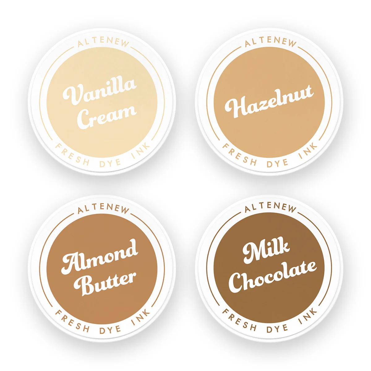 "Stamping has never been this fun and easy! If you are looking for beautiful, flawless coverage with a crisp impression every single time with your favorite stamps, our dye inks are a must-have. Our Fresh Dye Inks were created to give stunning crisp results when stamping and work especially well using our clear photopolymer stamps. The Delectable Delights color family brings a warm and inviting charm to your crafting projects. With its soft, creamy beige, sophisticated golden tan, cozy terracotta, and rustic earthy brown, this palette combines natural warmth and refined elegance, creating a sense of comfort and sophistication. Our ink color families were created to take the guesswork out of layered stamping. The colors in these color families range in shades from light to dark to give superior layering results. COLORS INCLUDED: ▪ Vanilla Cream ▪ Hazelnut ▪ Almond Butter ▪ Milk Chocolate INK TYPE: Dye PAD TYPE: Felt SIZE: Diameter: 2.75"" FEATURES: The high-viscosity dye inks (slightly different from our existing dye ink) are vibrant and will stamp perfectly alongside others in your collection. The modern and minimalist round ink cases feature a felt pad and were custom-designed with the user in mind. All it takes is a simple twist to open the lid and you’ll be ready for your next crafty project! ▪ Water-based- can be used for various techniques as well as stamping and water coloring. ▪ Fast-drying - great for layered stamping and reduces the risk of smudging. ▪ Uniform coverage - gives a beautiful uniform look on even solid stamps. ▪ Vibrant impression - gives bold, bright looks to your paper crafting projects. ▪ Re-fillable - when the ink pad starts feeling dry use re-inker to refresh. ▪ Ergonomic design - easy to hold and use; featuring a screw-on lid for effortless closing and opening ▪ Raised Pad - suitable for stamps of all shapes and sizes, and can be used to apply ink directly to paper ▪ Made in the USA PERFECT FOR: ▪ Stamping designs with multiple layers ▪ Stamping large solid designs ▪ Ink blending ▪ Watercoloring ▪ Coloring with dry media (ex. Color Pencils) Re-inker Bundle: Delectable Delights Fresh Dye Ink Re-inker Bundle Would you like these stunning ink shades in small/travel sizes? Check out our Delectable Delights Fresh Dye Ink Mini Cube Set!