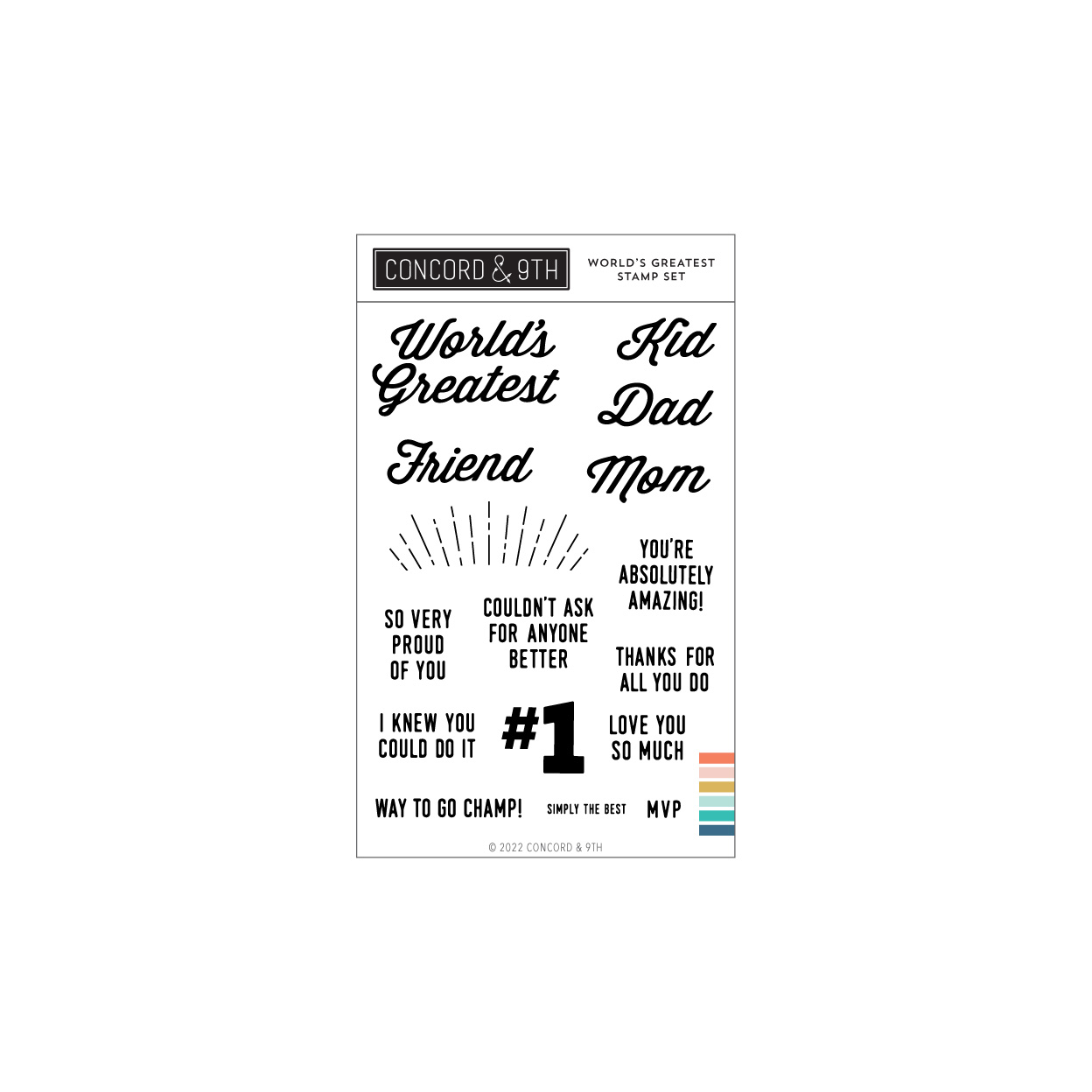 The World's Greatest Stamp Set is full of encouraging and celebratory sentiments that coordinate with the World's Greatest Dies to use on cards and other projects to commemorate the special people in your life! This 4" x 6" stamp set contains 16 pieces.