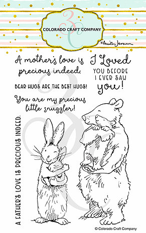 Send hugs and love to those you love with the Snuggles Clear Photopolymer Stamp Set featuring the illustrations of Anita Jeram for Colorado Craft Company. The set includes clear photopolymer stamps with a mommy/daddy bear hugging a cub and a mommy/daddy bunny snuggling a baby bunny. The stamps can be used with the coordinating Snuggles die set sold separately. This stamp set measures 4" x 6". It includes 7 stamps, 2 images and 5 sentiments. Sentiments include: "I loved you before I ever saw you", "Bear hugs are the best hugs", "You are my precious little snuggler", and more. Approximate Dimensions: Largest: 1.75" x 4", Smallest: 1.25" x 1.25".