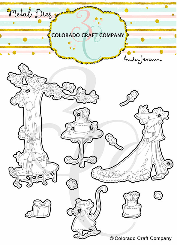 Make wedding cards the bride and groom with cherish for years to come with our Happily Ever After Dies featuring the illustrations of Anita Jeram for Colorado Craft Company! The package includes 10 thin metal dies that are compatible with most die cutting machines and coordinate with our Happily Ever After stamp set (sold separately). Dies include the bride and groom mice in an embrace, two young mice sitting beneath a tree, a table with the wedding cake, a single gift, a cake, a small mouse flower girl, and four individual flowers. Approximate Dimensions: Largest: 3.75" x 2.75", Smallest: 0.25" x 0.25".