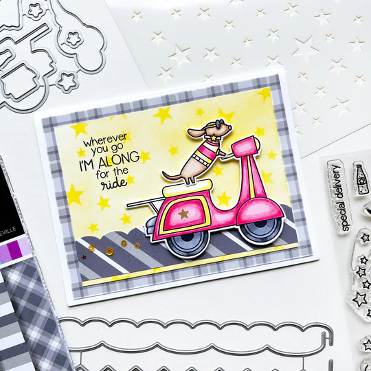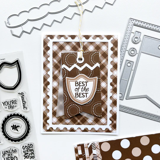 Add a Decorative Edge to your card layers or base with the Decorative Edge Dies. This set of three dies will quickly cut a zig zag, wide scallop or traditional scallop edge on your paper layers and patterned papers to add that little extra something. Each die is 6" long. Illustrated by Hanna Ji