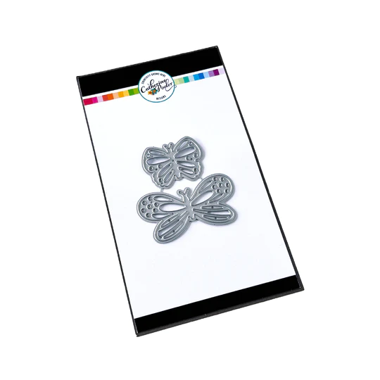 Accent your card or scrapbook spread with this pair of Butterfly Buddies. These dies feature two butterflies in different shapes and sizes. Try cutting them from a simple patterned paper or ink them up with a blending brush. This pair of butterflies will add a sweet accent to any paper project! Larger butterfly measures 2" x 1" and smaller butterfly measures 1 1/4" x 1". Illustrated by Becca Bonneville
