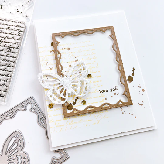 The Framed Wings Dies with its ornate frame and detailed butterfly is perfect for a focal point or as a background element. Try pairing it with the Flourished Butterflies Stamp Set or the Scripted Thoughts set for all your butterfly card needs. Frame measures approx 2-3/4" x 3-1/2"