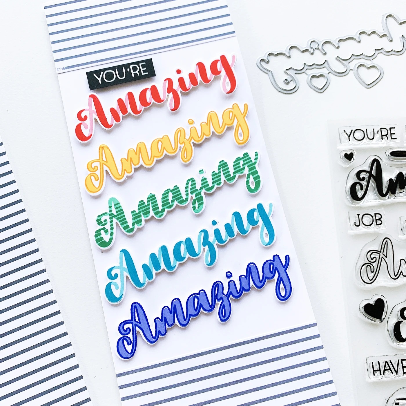Amazing times ahead with the Hello Amazing Stamp Set. This stamp set features mix and match multi-layer stamps to create a patterned and colorful "amazing" word along with other words and phrases for the perfect sentiment. Cut the stamped image out with the coordinating Hello Amazing Die for even more fun! Words include: Amazing (4 layers), You're, Just, Times, Ahead, Job, Hello, Day, Be, Have an, You look, News,, Make today. Designed by Lisa Kirkbride. Catherine Pooler clear stamp sets are made out of high quality photopolymer. They cling easily to our acrylic grid stamping blocks.