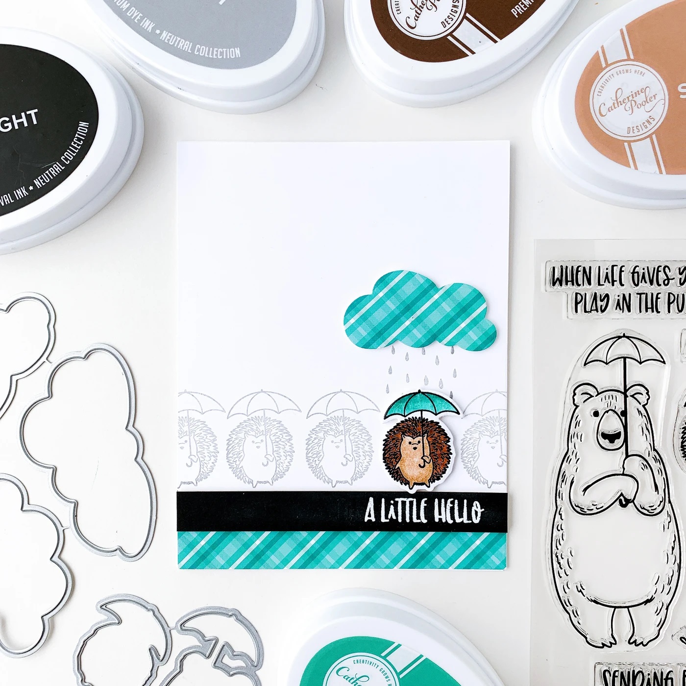 "When life gives you rain...play in the puddles!" That is the philosophy of these fuzzy woodland friends. The Puddle Play Stamp Set feature a sweet bear, fox and hedgehog who are all ready to have some fun in the rain! Equipped with their umbrellas and rain hat, these guys will bring a smile to anyone's face. Use the Puddle Play Dies to cut out the animals and the puddle for all of your little hello cards. Designed by Kat Uno. Catherine Pooler clear stamp sets are made out of high quality photopolymer. They cling easily to our acrylic grid stamping blocks.