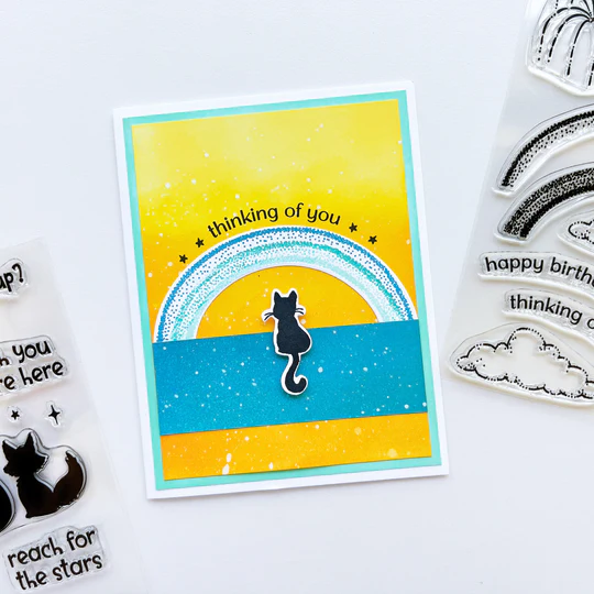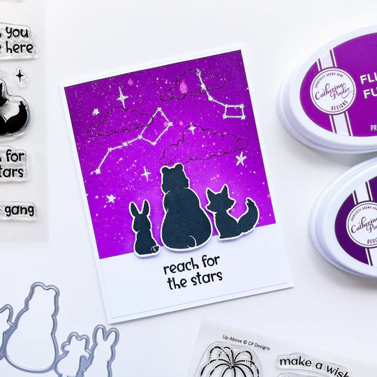 Create gorgeous scenes for many occasions with the fireworks, constellations and rainbows with the Up Above Stamp Stamp Set. Use this with the What's Up stamp set to change the theme for the cute little critters. Don't' forget your Up Above Dies to create layers and scenes! Designed by Kat Uno