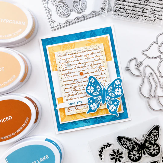 The Scripted Thoughts Stamp Set features a large scripted background texture and ink splatters to give a vintage look. Try pairing it with the Flourished Butterflies Stamp Set for your sympathy cards. Sentiments include: Know I a with you at this time, Hope this brightens your day, You're on my heart. Designed by Elizabeth Silver
