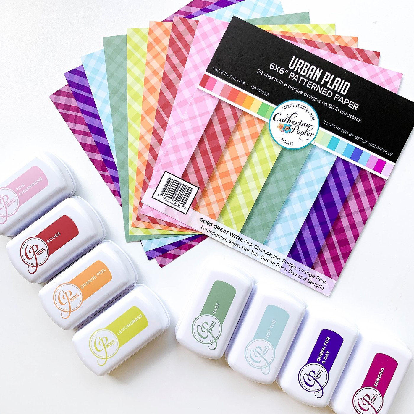 Who can get enough plaid? We know you can't so we have put together this special Urban Plaid Patterned Paper pack! This paper pack features one tone-on-tone plaid in each of the 8 Urban Oasis shades, Pink Champagne, Rouge, Orange Peel, Lemongrass, Sage, Hot Tub, Queen for a Day and Sangria. Mix and match them with some of the Boho Slimline Patterned Papers. You'll get three (3) sheets of each of the eight (8) different designs. Illustrated by Becca Bonneville. Catherine Pooler Designs patterned paper is 6" x 6" in size, single sided, made from 80# cardstock and printed in the USA.