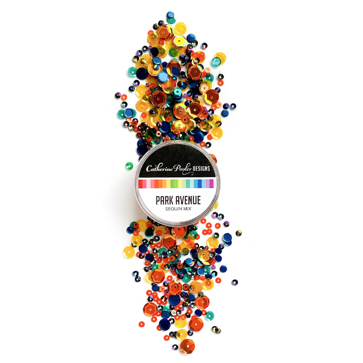 Notoriously home of the rich and famous is the area of Park Avenue in New York City. What better place for this sequin mix inspired by rich jewel tones of the the Luxe Ink Colors. This mix has firey shades of orange and yellow and pops of dark blues, purple and green. It's like a jar full of gemstones! Approximately 1 Tablespoon mixture packaged in a clear screw top round container.