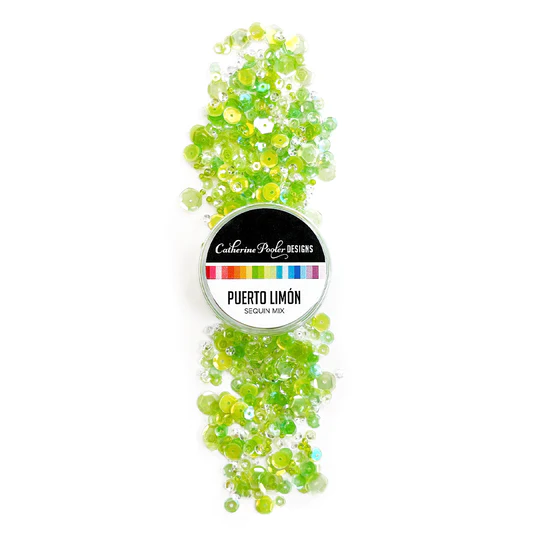 Picture it. Sipping a cold, citrusy drink on the beaches of Costa Rica and enjoying some rest and relaxation. That's the inspiration behind the zesty Puerto Limon Sequin Mix! This monochromatic, mix of bright greens is full of shimmer and iridescent shine. These sequins will coordinate for the extra little sparkle you need with the Favorite Prints Patterned Paper. Approximately 1 Tablespoon mixture sequins in multiple sizes.Packaged in a clear screw top round container.