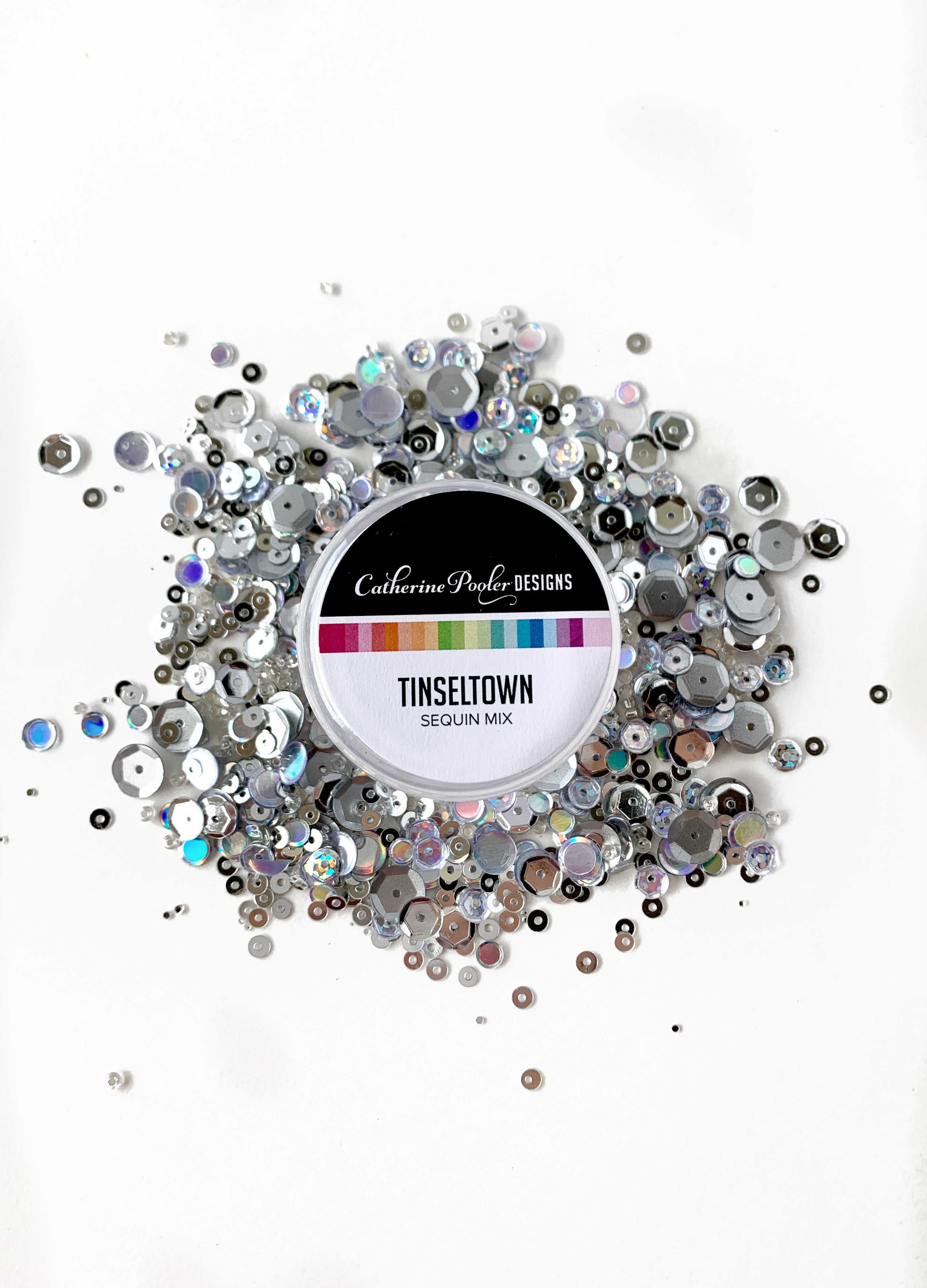 Add some tinsel and sparkle to your projects with the Tinseltown sequin mix! Approximately 1 Tablespoon mixture of silver, grey, sparkling hologram & clear sequins. Packaged in a clear screw top round container.