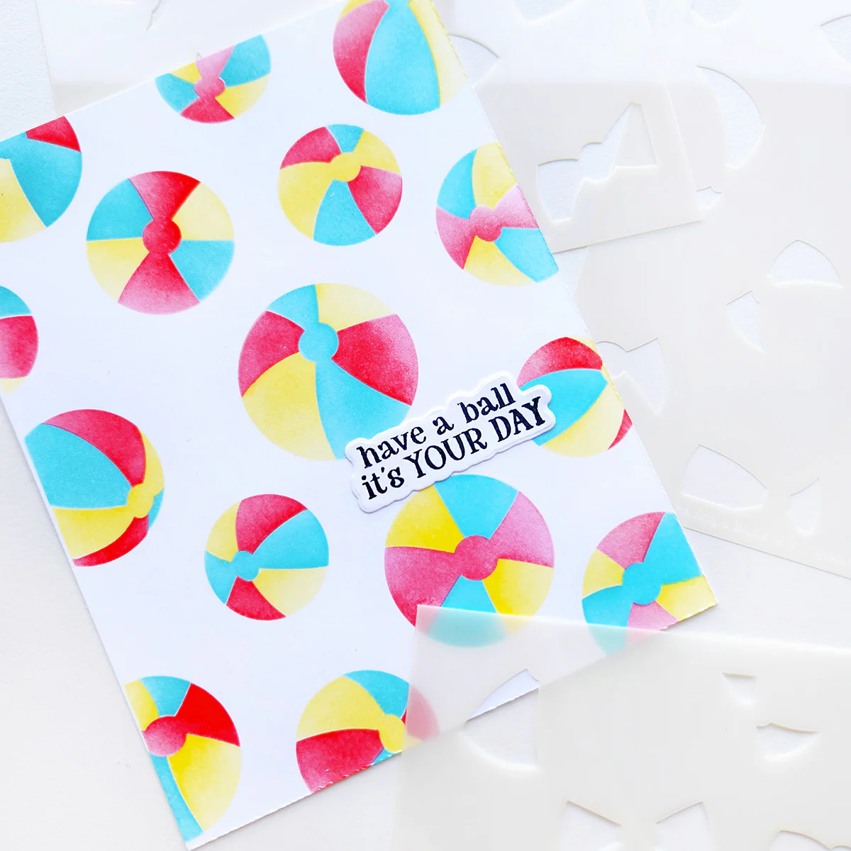 Bring playful energy to your projects with the Having a Ball Layered Stencil! This 3-layer stencil lets you build a bright and cheerful beach ball background-perfect for summer cards and party invites. It pairs perfectly with images from the Big Splash Collection, creating seamless scenes full of sunshine and fun. Use your favorite inks, pastes, or glittery mediums to add extra texture, shine, or sparkle to your design. It's a simple way to make your projects pop with poolside charm! Try using our Detail Blending Brushes for a multi-colored look! Set of 3 stencils with each measuring 4-3/4" x 6" in size. Illustrated by Elizabeth Silver