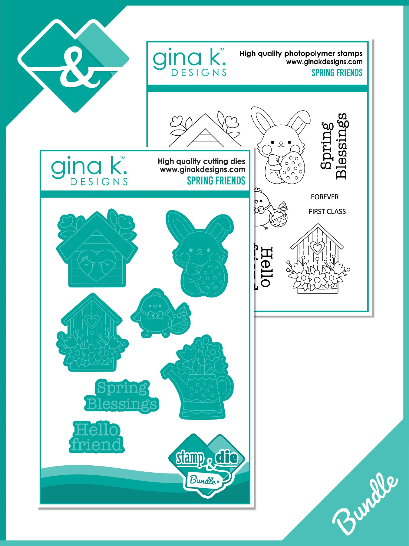 Spring Friends is a stamp set by Gina K Designs. This set is made of premium clear photopolymer and measures 4" X 4". Made in the USA. Gina K Designs wafer thin metal-etched dies are the highest quality available for your paper crafting projects. Our dies are compatible with most die-cutting machines. Follow the manufacturer's instructions for your specific machine for cutting wafer-thin dies. Dies are already cut apart and come on a magnetic board for easy storage. Gina K Designs dies are lead-free and non-toxic. Made in China. Available as a Stamp Set only or a Stamp and Die Bundle.