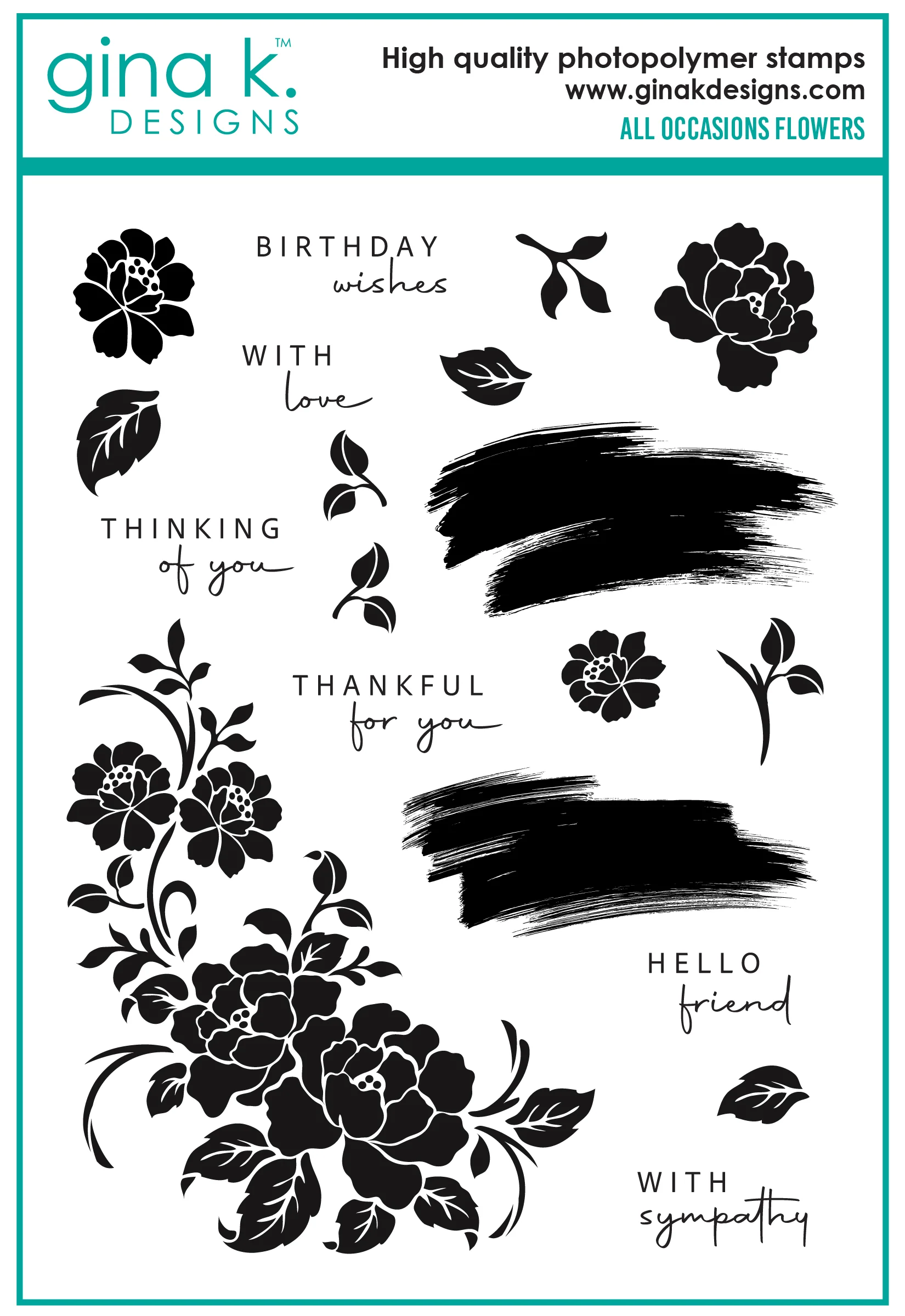 All Occasion Flowers is a stamp set by Gina K Designs. This set is made of premium clear photopolymer and measures 6" X 8". Made in the USA. Available as a Stamp Set only or a Stamp and Die Bundle