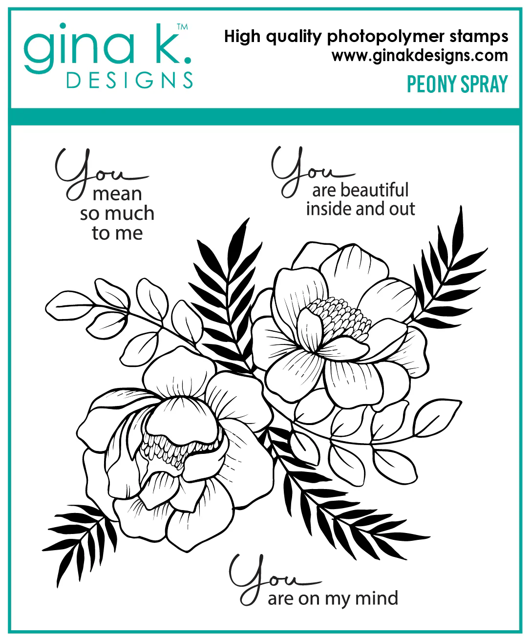 Peony Spray is a stamp set by Gina K Designs. This set is made of premium clear photopolymer and measures 4" X 4". Made in the USA