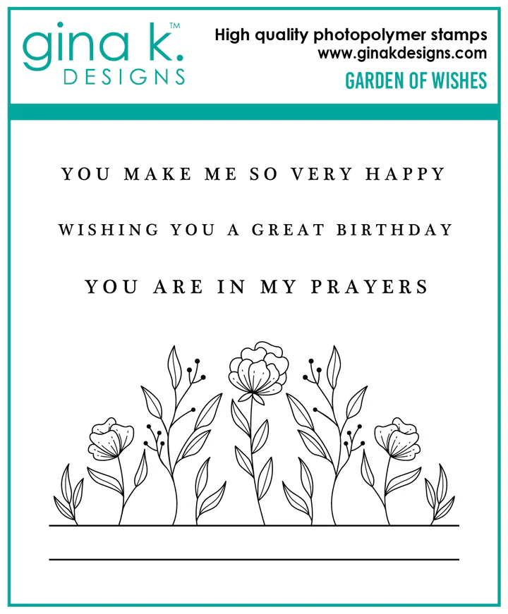 Garden of Wishes is a stamp set by Gina K Designs. This set is made of premium clear photopolymer and measures 4" X 4". Made in the USA