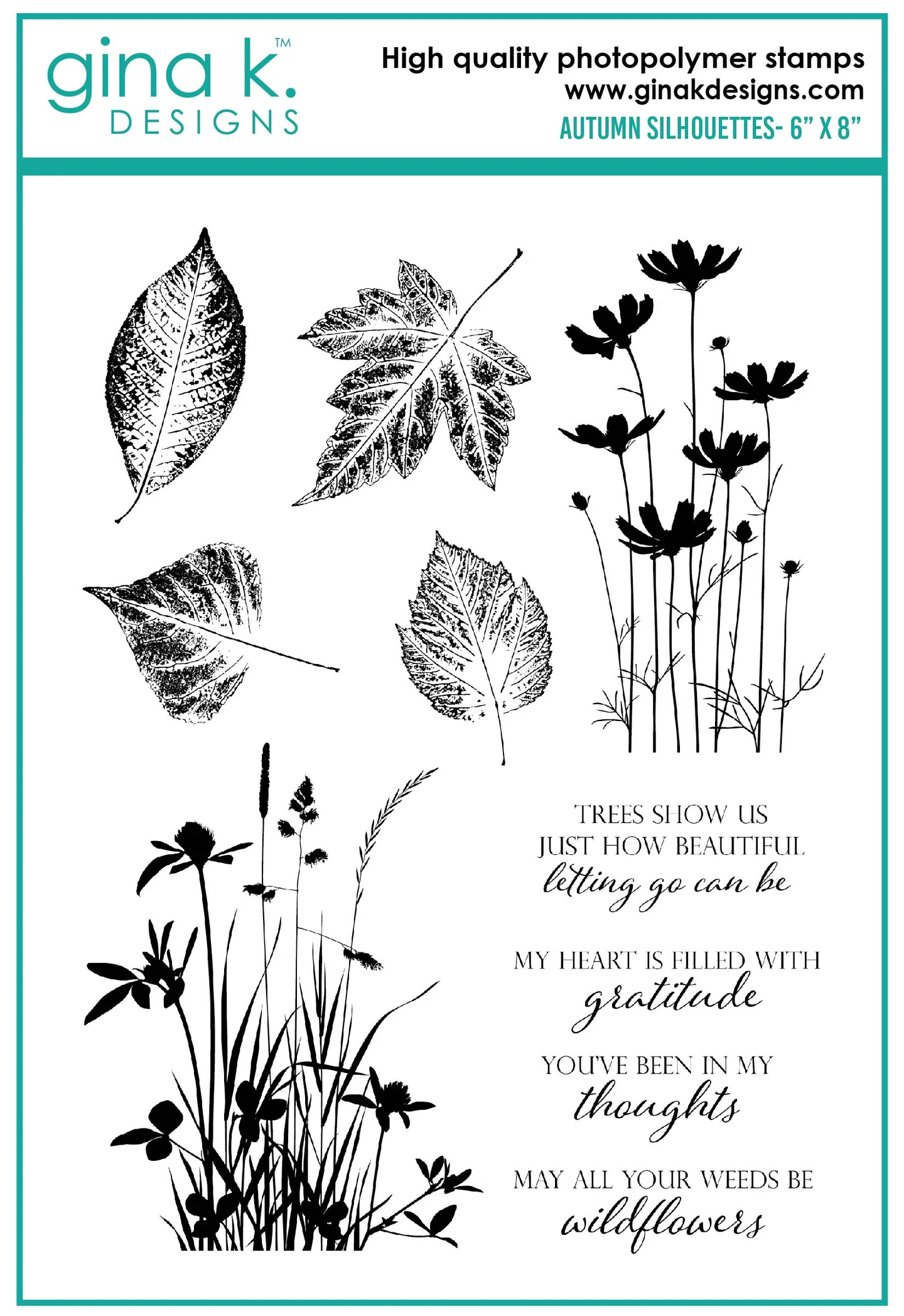 Autumn Silhouettes is a stamp set by Gina K Designs. This set is made of premium clear photopolymer and measures 6" X 8". Made in the USA