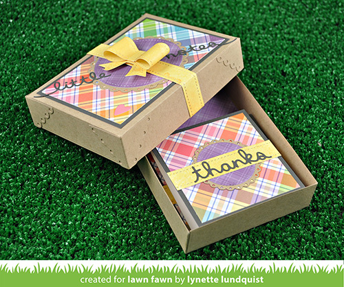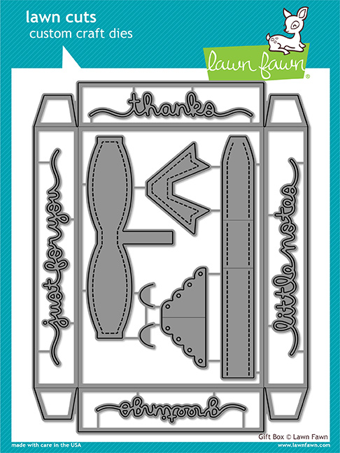 Create a gift box that is sure to make anyone smile! This set includes everything you need to build the base of a box, a cute lid with scalloped corners, and a closure band with a bow. It also contains four scripts sentiments to decorate the lid. This box is the perfect size for a set of 4-bar greeting cards or notecards! Lawn Cuts custom craft dies are high-quality steel, made in the USA, and are compatible with most die cutting machines! Visit lawnfawn.com for assembly instructions! approximate die sizes:; assembled box: 5 1/4" x 3 5/8" x 7/8"; "little notes": 3 7/8" x 1/2"; "just for you": 4 1/4" x 1/2"; "greetings": 3" x 1/2"; "thanks": 3 1/4" x 1/2"; assembled bow (with tails): 1 3/4" x 1 1/2"