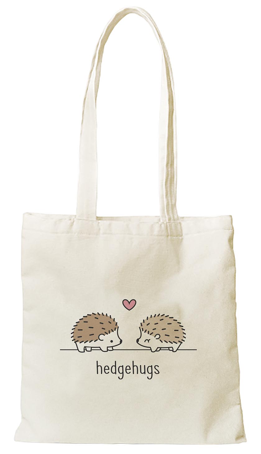 This tote bag features two little hedgehogs that are totes adorbs! Dimensions: 15 1/2"w x 15 1/2"h with 12.75" hanging strap Flat tote 7 oz. cotton Made in the USA Coordinating product ideas:Give this hedgehugs tote as a gift, along with a cute greeting card created with Hedgehugs!