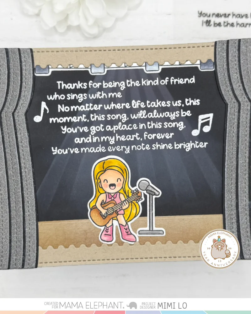 Sung Sayings clear stamp set is filled with heartfelt, music-inspired sentiments. Designed for anyone who finds comfort in music, these uplifting phrases pair beautifully with any project celebrating hope, joy, and connection. Whether you're crafting for a fellow music lover, commemorating a special moment, or simply adding a touch of harmony to your projects, this set lets your creativity sing! Sentiments: You've got a place in this song, and in my heart, forever. You never have to go through it alone. I'll be the harmony to your melody. Your heart sings a song this world needs to hear. When words fall short, let music and my love fill the space. We may be playing different melodies, but we're still dancing to the same beat. Thanks for being the kind of friend who sings with me on and off the stage. Thank you for being a part of my song. You've made every note shine brighter. No matter where life takes us, this moment, this song, will always be ours. 4x6 Photopolymer Stamp Set Includes: 5 Image Stamps. 8 Sentiment Stamps. Approximate measurements: we may be playing different... 3.3" x .5, your heart sings a song ... 2" x .46", no matter where life... 3.2" x .46"