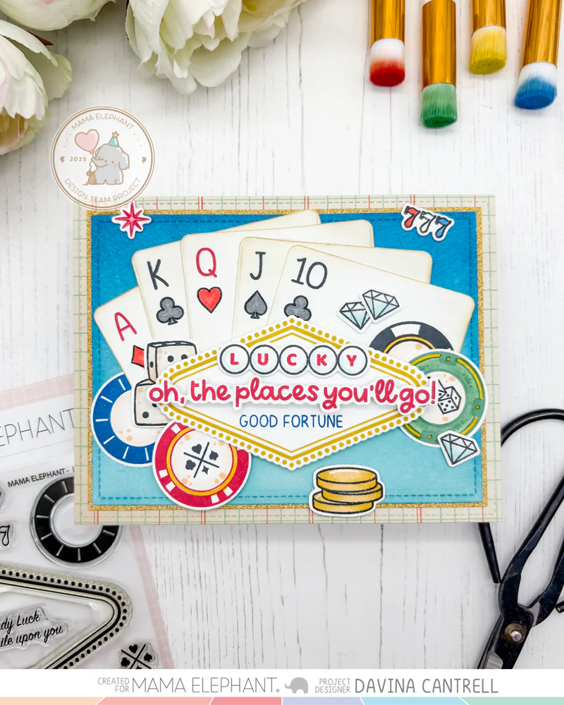 4x6 Photopolymer Stamp Set Includes: 14 Image Stamps, 6 Sentiment Stamps. Approximate measurements: Chip 1.6" x 1.6", Flashy Border 3.4 x 1.85", Heart .3" x .3". Coordinating Creative Cuts (Sold Separately): Lady Luck CC