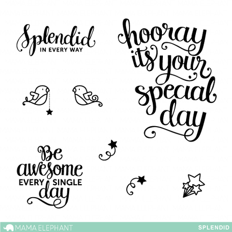 4x6 Photopolymer Stamp Set: Contains 9 Stamps: 3 sentiments and 6 images.Approximate measurements: hooray its your special day 3-1/2" x 3",Splendid 2-3/8" x 1",Be awesome 2" x 1-7/8"