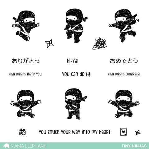 4x6 Photopolymer Stamp Set:Contains 18 Stamps: 7 Sentiment Stamps and 11 Image Stamps. Approximate measurements: Sneaking Ninja 1-1/8" x 1-5/8",hi-ya 1/8" x 1/2" ,Card 1/8" x 3/8".