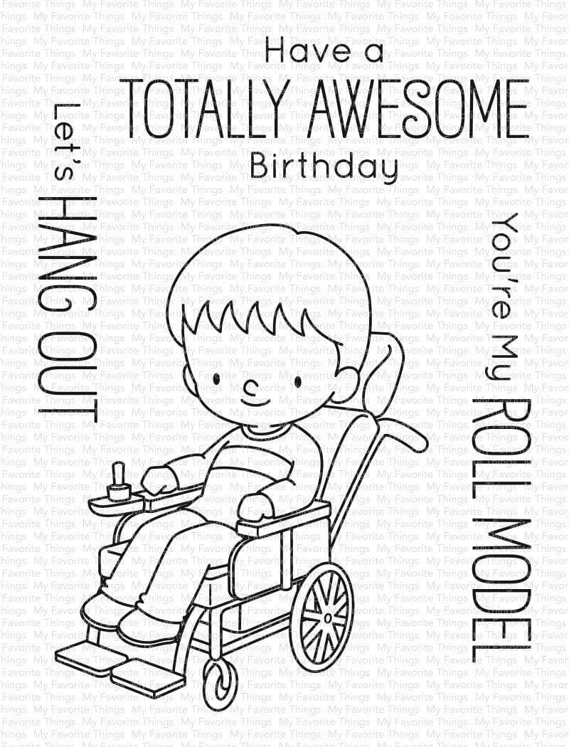 This sweet Birdie Brown character will cruise his way right into your heart. He has the coolest wheels around and the most charming disposition. Customize the striped shirt, hair, and wheelchair for a boy in your life that would love to have his achievements recognized. Our clear stamps are made in the USA and include the name of the set on the sticker for easy identification. 3" x 4" clear stamp set - (4) piece set. Sentiments: Have a Totally Awesome Birthday, Let's Hang Out, You're My Roll Model. Boy 2" x 2 5/8".
