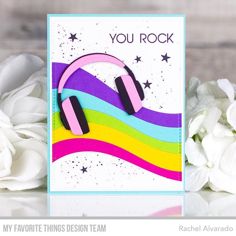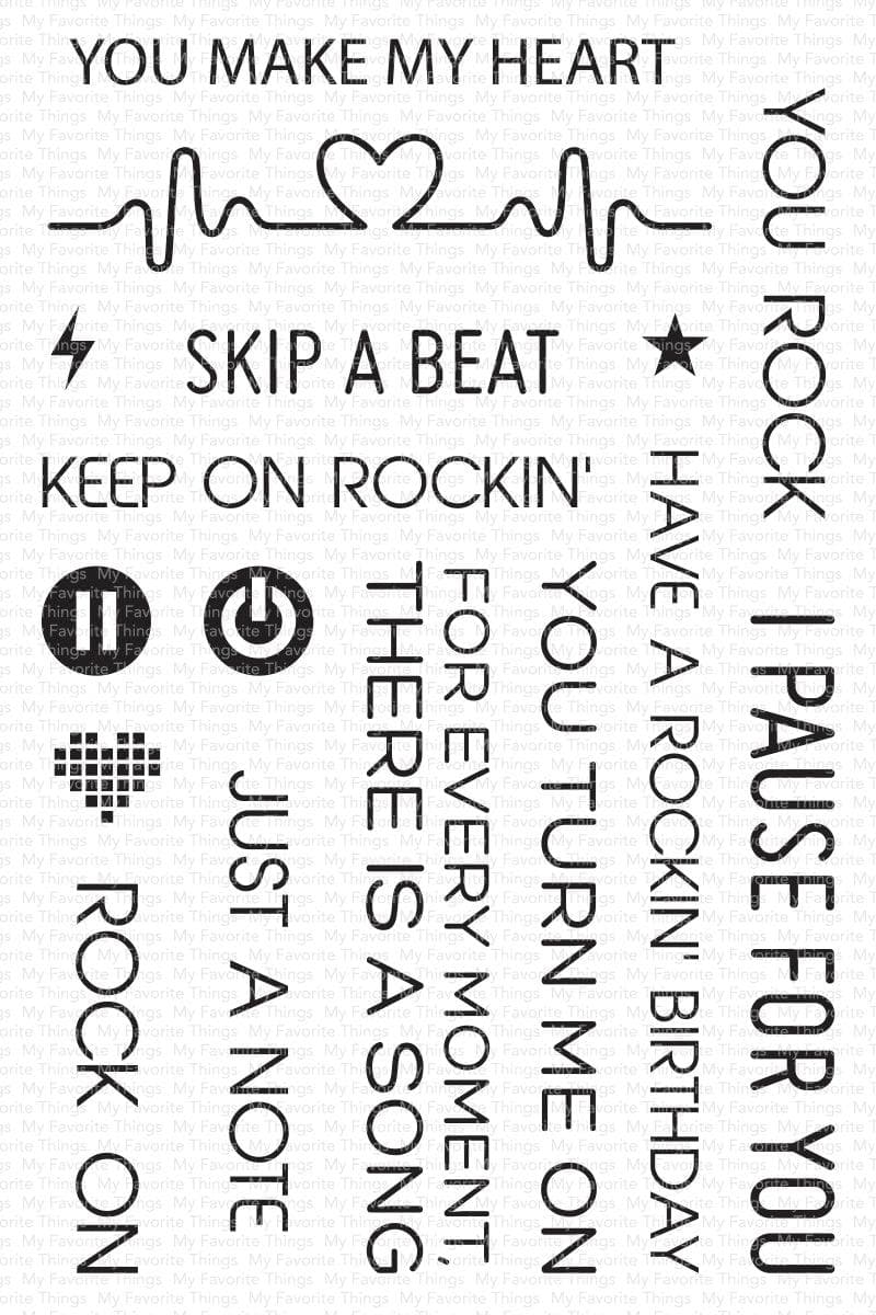 This music-themed stamp set will delight your eyes, entice your ears, and rock your world. Various all-occasion sentiments, some featuring graphic accents, create a harmonious duet with the coordinating images. Keep On Rockin' has been updated from a 4" x 8" set to a 4" x 6" set. Some sentiments and images have been removed to fit this new size. The "You Make My Heart Skip a Beat" sentiment has been split into three parts to provide the ability to change the positioning of each line and choose whether you'll use the heartbeat line design with the sentiment. Our clear stamps are made in the USA and include the name of the set on the sticker for easy identification. 4" x 6" clear stamp set - (16) piece set. Sentiments: You Make My Heart Skip a Beat, Keep On Rockin', You Rock, I Pause for You, Have a Rockin' Birthday, You Turn Me On, For Every Moment, There Is a Song, Just a Note, Rock On. Heart line 3" x 5/8", Lightning bolt 1/8" x 1/4", Star 1/4" x 1/4", Buttons (2) 1/2", Heart 1/2" x 3/8".