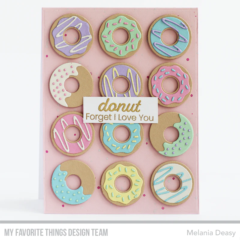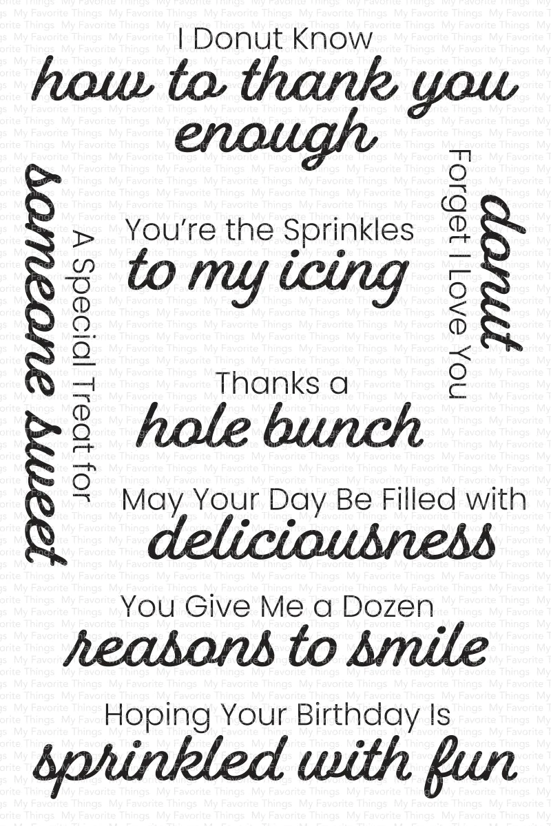Sweet sentiments are a dime a dozen, but the sweetest sentiments for your donut treats are sprinkled with fun! This sentiment assortment will be the icing on top of your donut cards and tags - a delicious mix of phrases that will sweeten any occasion. Our clear stamps are made in the USA and include the name of the set on the sticker for easy identification. July 2023 Release - 4" x 6" clear stamp set - (8) piece set. I Donut Know How to Thank You Enough 3 1/2" x 1", You're the Sprinkles to My Icing 2 1/8" x 5/8", Thanks a Hole Bunch 2 1/8" x 1/2", May Your Day Be Filled with Deliciousness 2 7/8" x 1/2", You Give Me a Dozen Reasons to Smile 3 1/8" x 1/2", Hoping Your Birthday Is Sprinkled with Fun 3 1/2" x 3/4", Donut Forget I Love You 1 3/4" x 5/8", A Special Treat for Someone Sweet 2 7/8" x 1/2".