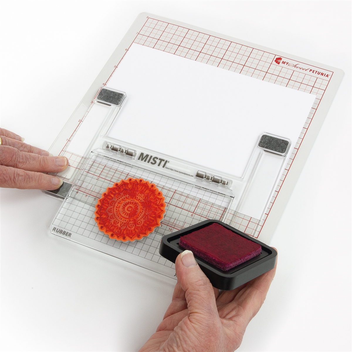 MISTI Lite's simple hinged design provides consistent stamping for the novice or experienced craft. This tool accomodates rubber cling mount stamps or clear stamps - simply flip the hinged stamp panel to suit. Your Lite MISTI enables you to use a wide variety of stamping techniques that are impossible with traditional stamp mounts. Push down on the Lite MISTI pressure panels or use alongside a Power Mag and a Petunia Platform (both sold separately) to guarantee a firm card grip. This essential tool offers all the time and money saving features of larger MISTI products in the range - enabling you to make professional looking cards that reflect your creativity on the go! Your Lite MISTI is an investment you will truly treasure and enjoy. Dimension: 5.3" X 6.7", Stamp area: 5.75 x 3 3/8. NOTE: Magnets and platform not included. Features - Its simple hinge design provides consistent stamping for the novice or experienced crafter. It will accommodate both the red rubber cling mount stamps and clear stamp.