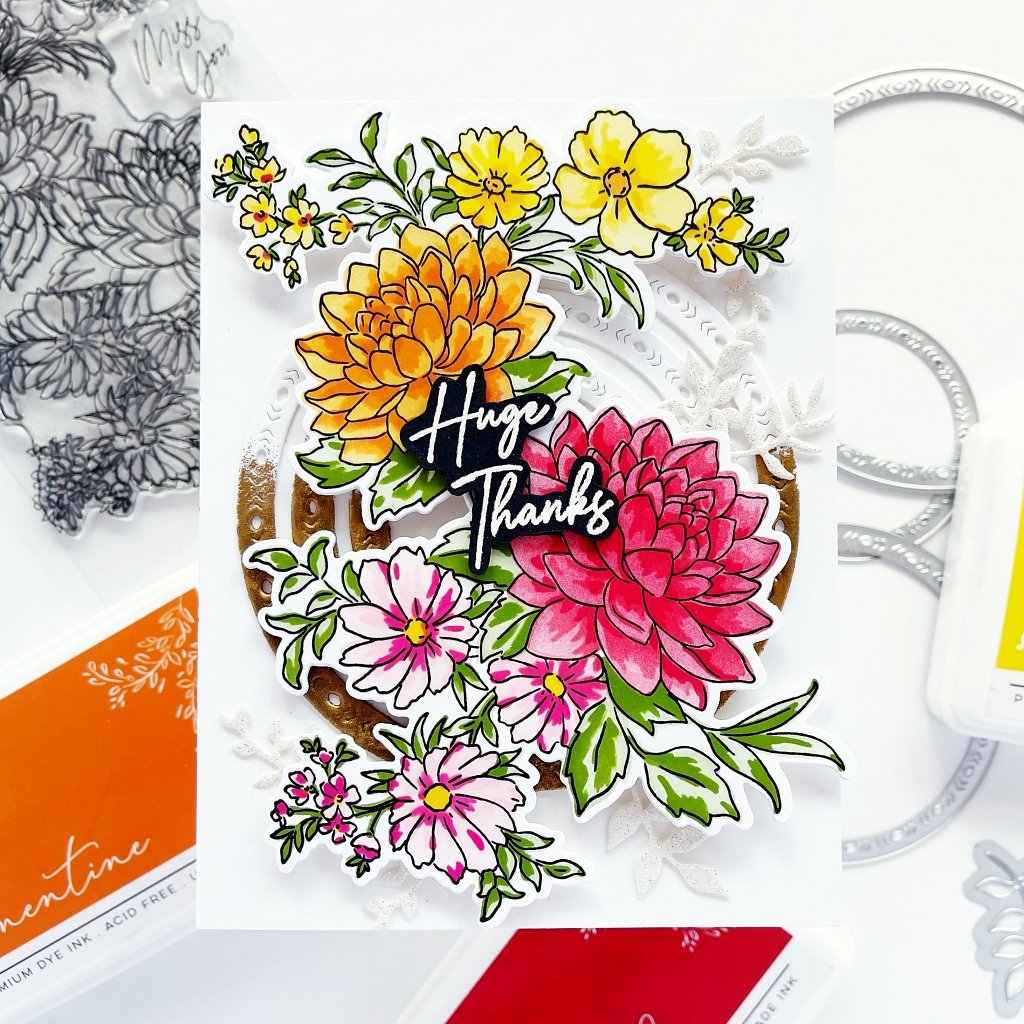 1 pc die set to coordinate with the Dahlia Bunch stamp set and Dahlia Bunch layering stencil set. This die cuts out the entire floral image. The approximate measurement of this die is 4" x 5.5".