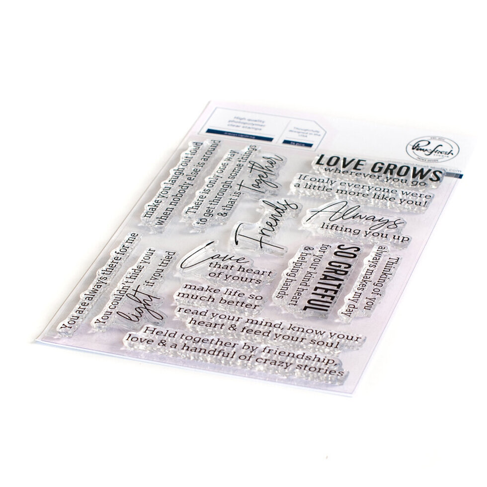 4 x 6 photopolymer clear stamp designed by Kaitlin Sheaffer. This friendship themed stamp set includes 14 uplifting and heartfelt sentiments, perfect for any occasion. Many of these unique sentiments can also be used beautifully in your scrapbooking layouts, mini albums and notebook spreads. With a combination of scripted and serif fonts, you will reach for this lovely sentiment stamp set time and time again! The following sentiments are included in the stamp set: -Love grows wherever you go, -If only everyone were a little more like you!, -Friends, -make you laugh out loud when nobody else is around, -There is only one way to get through some things & that is together, -Always lifting you up, -Thinking of you always makes my day, -So grateful for your kind heart & helping hands, -Love that heart of yours, -You are always there for me, -You couldn't hide your light if you tried, -make life so much better, -read your mind, know your heart & feed your soul. -Held together by friendship, love & a handful of crazy stories