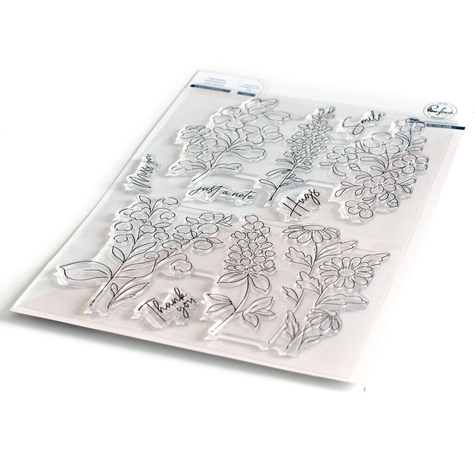 6 x 8 photopolymer clear stamp set designed by Inna Moreva. Made to coordinate with the Beautiful Blooms die set & Beautiful Blooms layering stencil set. Available for purchase separately. Create stunning floral gardens and bouquets with this set of whimsical blooms! The floral designs are merged together on two main stamps, making it easier to line up with the coordinating layering stencil set. Easily ink blend colors to the beautiful blooms with the coordinating stencils in all your favorite shades of ink. You can also color the outline stamped image in your favorite mediums, including watercolor, markers and colored pencils. By offering different options within each design, you get the utmost of versatility when using our products! The following sentiments are included in the stamp set: -just a note -Hugs -Miss you -Thank you.