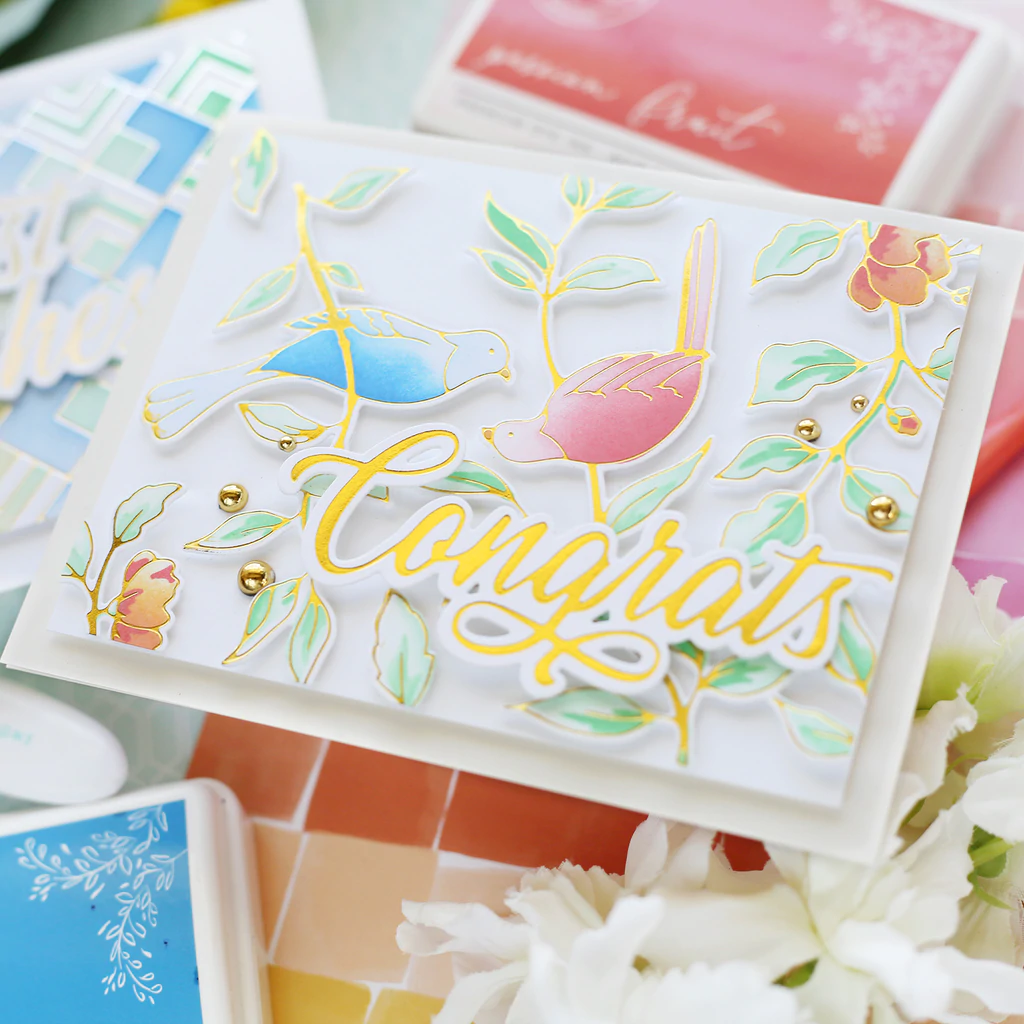 1 piece hot foil plate to coordinate with the Songbirds on Branches layering stencil set and Songbirds on Branches die. There is also a matching Songbirds on Branches stamp set. Create a stunning, letterpress feel to all your projects with a Pinkfresh feel using our beautiful hot foil plates! Designed to work in any standard hot foil system, be sure to follow the instructions in your manual for a standard hot foil plate. Once foiled, the birds & branches are perfect for all types of coloring; including watercolor, alcohol & brush markers, colored pencils and no-line coloring. Combine with the coordinating Songbirds on Branches layering stencil set to ink blend the images with all 48 shades of our premium dye inks. Use the coordinating Songbirds on Branches die to cut out all the images in one easy pass through your diecut machine.