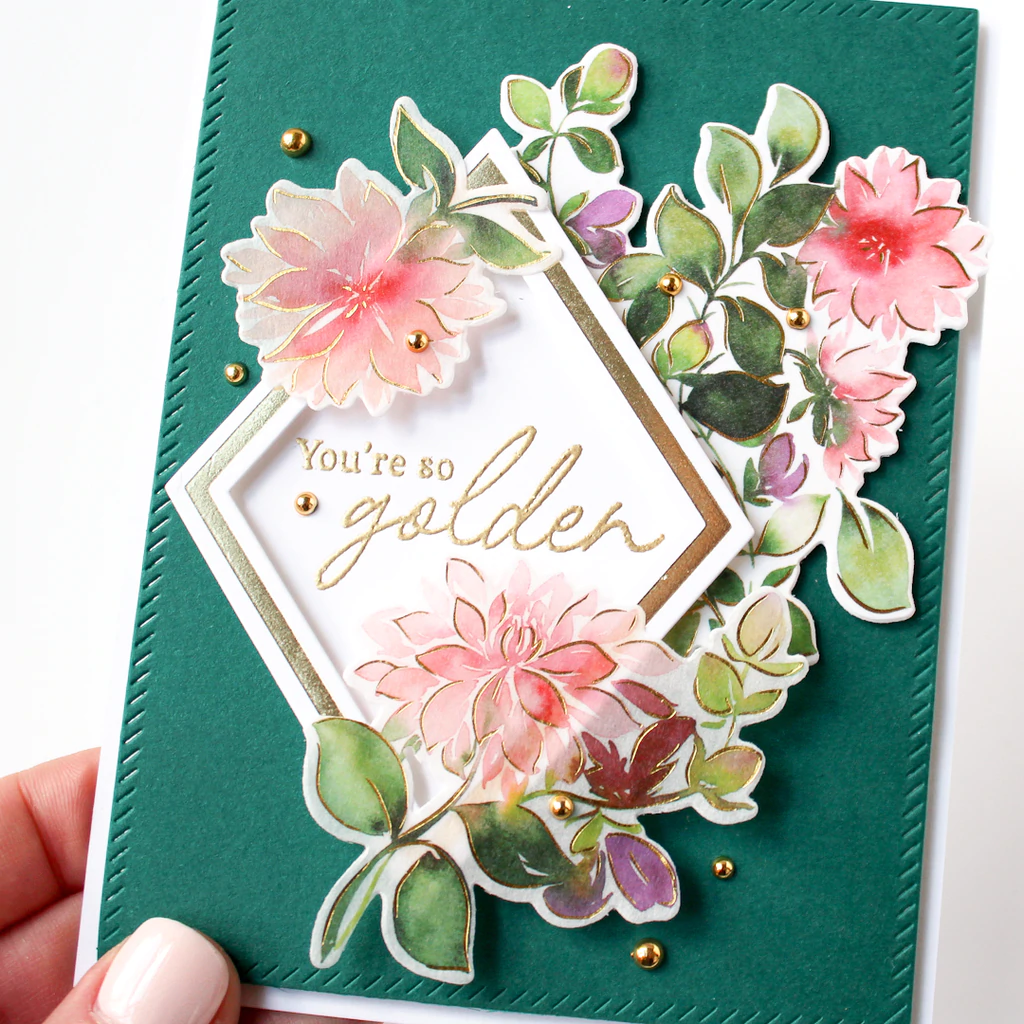 8 piece die set made to coordinate with the Nested Diamonds hot foil plates. There is a die to cut around both the outside and inside of each Nested Diamond hot foil plate, giving you the ability to create a shaped panel of frame. Each die leaves a thin white border around the hot foiled design. You can also use the die set alone for creating perfect diamonds in 8 different sizes. Approximate Measurements: Diamonds range from 0.5" to 5.2"